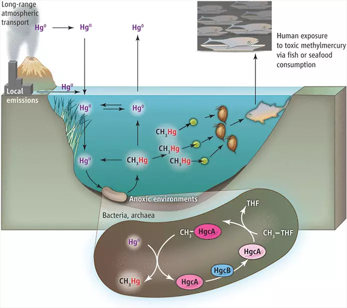 汞是一種有毒性的重金屬元素,會對人類和生態(tài)系統(tǒng)健康造成嚴重危害,目前已成為國際社會廣泛關注的環(huán)境污染物之一。人類在食用含有超標汞的產(chǎn)品后,可引起心血管系統(tǒng)、免疫系統(tǒng)、神經(jīng)系統(tǒng)等受損,歷史上嚴重的汞中毒事件包括1956年的日本熊本縣水俁病事件、1971年伊拉克全國性汞中毒事件等。汞通常以不同的形態(tài)(無機汞和有機汞)存在。其中,無機汞可通過生物體內(nèi)代謝的方式排出體外,而有機汞(主要為甲基汞,水俁病的罪魁禍首)則易于與有機配位體基團結(jié)合,導致其在生物體內(nèi)分解速度緩慢,毒性更強。