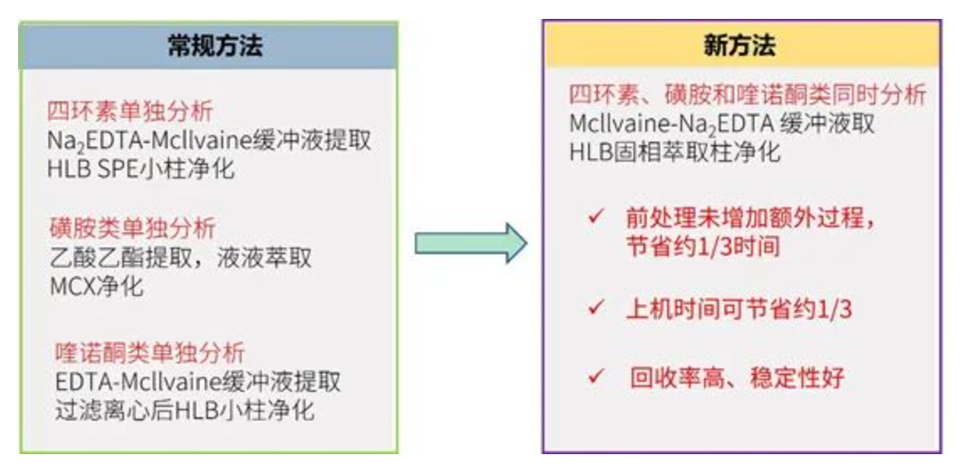 2022年《國家食品安全監(jiān)督抽檢實(shí)施細(xì)則》(簡(jiǎn)稱國抽)與2021年相比,在畜禽肉及副產(chǎn)品項(xiàng)下多個(gè)產(chǎn)品種類中新增了該檢測(cè)方法,可同時(shí)檢測(cè)四環(huán)素、磺胺及喹諾酮這三大類獸藥,共計(jì)36個(gè)獸藥品種,適用于牛、羊、豬、和雞的肌肉、肝臟和腎臟組織中多獸藥殘留檢測(cè)。