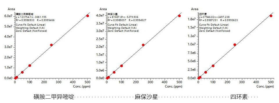 制作2~500 μg/L范圍內(nèi)的基質(zhì)混合標(biāo)準(zhǔn)工作液進(jìn)行測(cè)定,外標(biāo)法定量。相關(guān)系數(shù)r均在0.998以上。