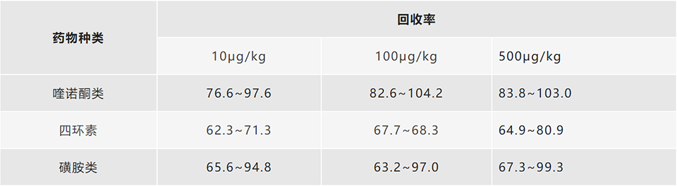 GB 31650-2019 《食品安全國家標(biāo)準(zhǔn) 食品中獸藥最大殘留限量》中對(duì)不同食品動(dòng)物中的四環(huán)素類、喹諾酮類抗生素最大殘留限量(MRLs)都有明確規(guī)定,其中磺胺類抗生素在所有動(dòng)物食品基質(zhì)的MRLs均為100 μg/kg。