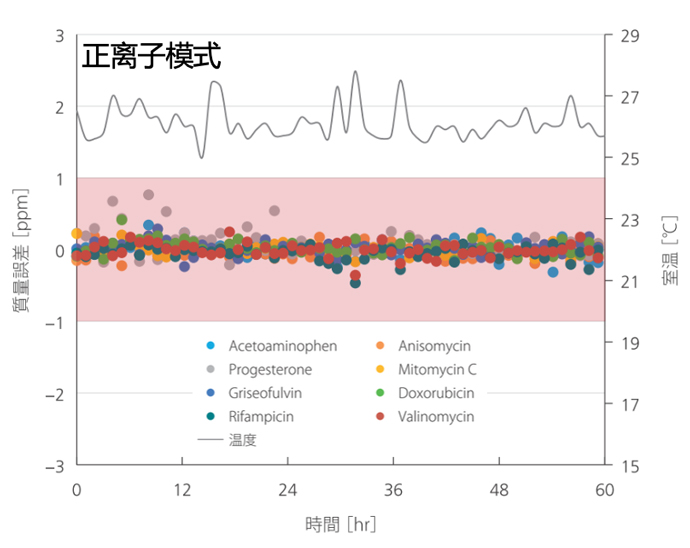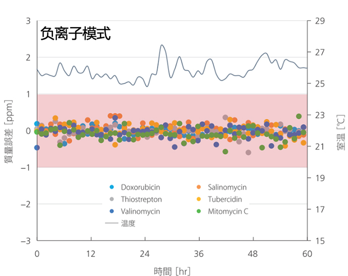 LCMS-9050無論正/負離子采集模式下,不同質量化合物(m/z150~1500)在長達60小時的測試周期內,質量數(shù)誤差未超出1 ppm,顯示了高質量精度下極好的數(shù)據(jù)穩(wěn)定性。穩(wěn)定的質量數(shù)對于未知物鑒定客戶可謂福音,讓未知變已知成為可能。