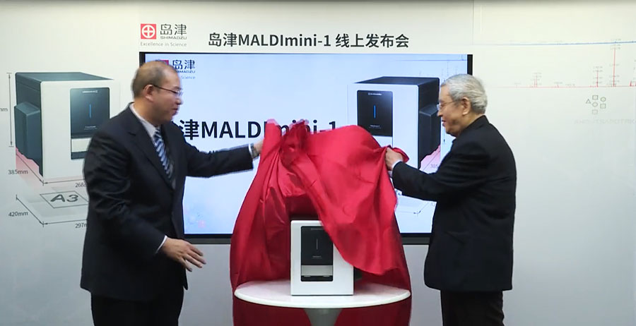 致辭結(jié)束后,軍事醫(yī)學(xué)研究院儀器測試分析中心楊松成研究員與島津分析計測事業(yè)部市場部胡家祥部長共同為新品進行了揭幕,宣告島津全新MALDImini-1基質(zhì)輔助激光解吸電離數(shù)字離子阱質(zhì)譜儀正式發(fā)布。