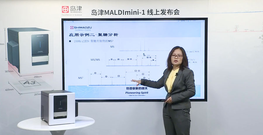 揭幕過后,島津分析計測事業(yè)部市場部MALDI高級產(chǎn)品經(jīng)理胡曉慧進行了新品講解,詳細介紹了島津MALDI-TOF發(fā)展史和島津MALDImini-1特點,并提到了MALDImini-1在糖肽結(jié)構(gòu)分析、聚糖分析、蛋白鑒定及識別抗體藥物結(jié)合物位點等四個方面的應(yīng)用示例。