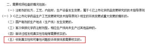 較后,友情提醒:2018年5月14日,國(guó)家藥品監(jiān)督管理局發(fā)布了《關(guān)于加強(qiáng)化學(xué)仿制藥注射劑注冊(cè)申請(qǐng)現(xiàn)場(chǎng)檢查工作的公告(2018年第20號(hào))》,公告列出了五種需要現(xiàn)場(chǎng)核查情形: