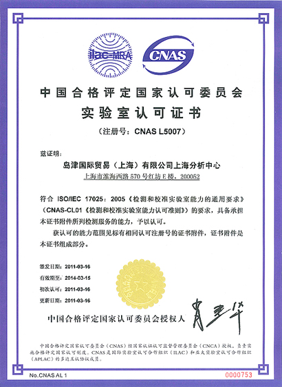 2011年3月,島津國際貿(mào)易(上海)有限公司上海分析中心正式獲得中國合格評(píng)定國家認(rèn)可委員會(huì)(CNAS)頒發(fā)的認(rèn)可證書。島津上海分析中心依據(jù)CNAS-CL01:2006《檢測和校準(zhǔn)實(shí)驗(yàn)室能力認(rèn)可準(zhǔn)則》的要求加強(qiáng)對(duì)檢測實(shí)驗(yàn)室的規(guī)范化管理,通過CNAS認(rèn)可,表明上海分析中心具備了按有關(guān)國際認(rèn)可準(zhǔn)則開展檢測服務(wù)的技術(shù)能力,獲得了簽署互認(rèn)協(xié)議方國家和地區(qū)認(rèn)可機(jī)構(gòu)的承認(rèn),向客戶展示了良好的行為規(guī)范,滿足采購方和法規(guī)對(duì)檢測/校準(zhǔn)真實(shí)度和可信度的要求,是符合國際ISO/IEC 17025:2005標(biāo)準(zhǔn)的實(shí)驗(yàn)室;通過CNAS認(rèn)可,提高了全體科研人員對(duì)質(zhì)量控制和質(zhì)量風(fēng)險(xiǎn)的認(rèn)識(shí),增強(qiáng)了責(zé)任意識(shí),進(jìn)一步提升了自身的質(zhì)量管理水平和技術(shù)能力。