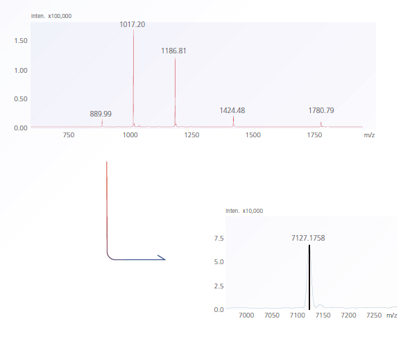 LCMS-2050的寬質量范圍是測定大分子分子量的有力工具,例如寡核苷酸、多肽、蛋白質、聚合物等。例如,在 LCMS-2050上分析反義寡核苷酸諾西那生鈉,會檢測到m/z889到1781一系列的從4價到8價的去質子化離子峰。使用LabSolutions LCMS的去卷積功能,諾西那生鈉的分子量計算為7127.1760,與理論值的誤差為0.05 Da寬質量范圍有利于這種類型的分析,因為包含了更多的解卷積峰使得分子量計算結果更可靠。