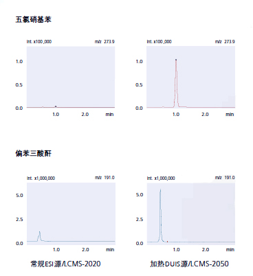 傳統的質譜檢測器需要將離子源從ESI源切換到APCI源,以檢測低極性化合物,如五氯硝基苯和偏苯三酸酐。利用 LCMS-2050上的加熱DUIS源,無須切換即可實現高靈敏度檢測。