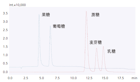 HPLC廣泛用于糖的分析。然而,糖類化合物無紫外吸收,因此無法用普通的LC-UV檢測器進行分析。使用質譜法可以高靈敏度分析糖類。右圖顯示了使用LCMS-2050分析五種糖類化合物獲得的質譜圖。LCMS-2050可以對單糖和二糖進行高靈敏度的定性和定量分析。