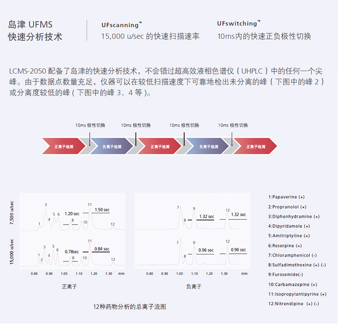 對于沒有紫外吸收的化合物,LCMS-2050依然具有良好的靈敏度。此外,LCMS-2050可以快速檢測正離子和負離子,掃描速度達到15,000u/sec,正負切換時間為10ms。因此,LCMS-2050是UHPLC色譜和高通量實驗室的理想檢測器。