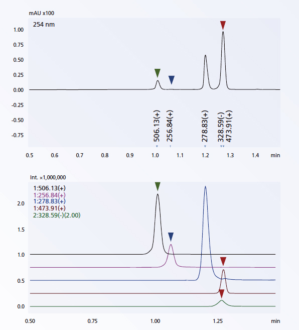 上述五種藥物化合物的色譜圖證明了MS檢測優(yōu)于UV檢測。MS檢測以15,000u/sec的掃描速度和10ms的正/負離子切換進行。LCMS-2050準確檢測四種正離子成分和一種負離子成分。在UV色譜圖中,在保留時間1.07分鐘處未觀察到峰( 以藍色▼表示)。但在質譜圖中觀察到了強信號,表明MS對無紫外吸收的化合物具有出色的檢測能力。保留時間1.28分鐘處的峰( 用紅色▼表示) 在UV色譜圖中似乎是單一組分,但質譜圖證實兩種化合物未分離開。 在保留時間1.01分鐘時檢測到的組分( 以綠色▼表示) 對于UV檢測的響應較弱,但高靈敏度的LCMS-2050可以輕松準確的定量。
