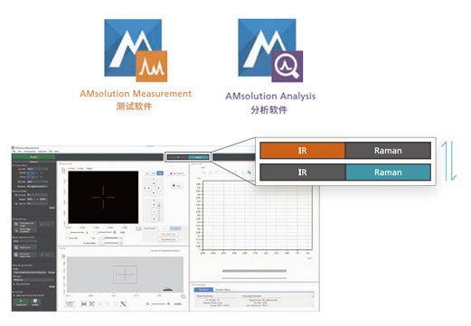 AMsolution包括測(cè)試軟件(AMsolution Measurement)和分析軟件(AMsolution Analysis),可以自由分屏顯示。測(cè)試軟件可以在同一個(gè)軟件窗口內(nèi)控制完成紅外和拉曼光譜的測(cè)定。整個(gè)過程,從圖像采集到同一位置的紅外光譜和拉曼光譜測(cè)定,都可以順暢的完成。分析軟件可以疊加顯示并檢索紅外和拉曼光譜,自建譜庫(kù)等。