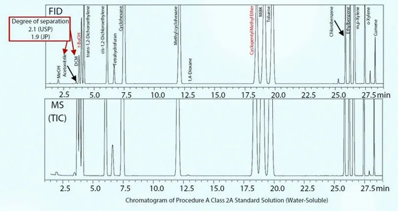 在兩種不同檢測(cè)器中使用相同的色譜柱并以恒定的線速度模式進(jìn)行分析,可以使所有分析物的峰保留時(shí)間相匹配,進(jìn)而很好的驗(yàn)證FID檢測(cè)到的峰的質(zhì)譜圖,定性更準(zhǔn)確。同時(shí)由上述圖2可知,添加到2A類標(biāo)準(zhǔn)溶液中的高關(guān)注度目標(biāo)物t-BuOH和CPME(紅色標(biāo)記的化合物)與其他分析物達(dá)到很好的分離,恒線速度模式完美應(yīng)對(duì)USP467及藥典等標(biāo)準(zhǔn)方法。
